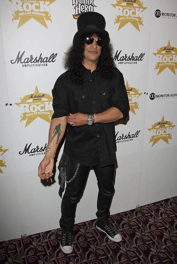 29. СлэшУ Слеша несколько сложных татуировок, в том числе череп в шляпе с буквами «DTYD» – пей, пока не упадешь – на левой руке. Но та, которой рокер хвастается здесь, силуэт известный как “VR girl” – одна из эмблем, презентующая группу гитаристов «Velvet Revolver».