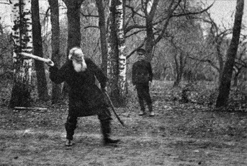 Лев Николаевич Толстой играет в "городки" в Ясной Поляне, 1909 г.