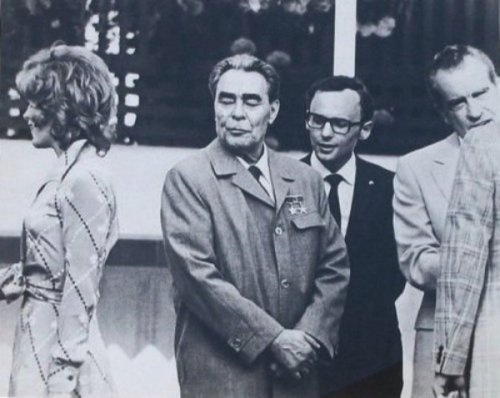 Леонид Брежнев рядом с президентом Никсоном не может оторвать взгляда от попки актрисы Джил Сэнт Джон.