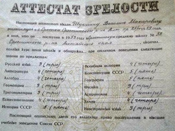 Но мечты молодого парня были совсем другими. Он грезил о ВГИКе. Оставив свою первую возлюбленную на произвол судьбы, в 1954 году Шукшин уезжает в Москву. Чтобы собрать Василия в дорогу и купить билет, иметь подъемные на первое время, матери пришлось продать кормилицу-корову. Сначала Василий подал документы на режиссерский факультет. Известный ныне кинорежиссер и однокурсник Шукшина Александр Митта рассказывал, что в представлении Василия кино делается сообща – артелью, совместно принимая решение, как играть. Но, когда в действительности оказалось, что все подчиняются режиссеру, он и решил стать таковым. На экзамене Михаил Ромм задал ему вопрос о Пьере Безухове. На что получил обескураживающий ответ: «Я «Войну и мир» не читал: толстая книжка – времени не было». Ромм тогда поинтересовался: «Что же, вы никогда толстых книг не читали?» — «Почему же… одну прочел – «Мартин Иден». Хорошая книжка». И тут Ромм взорвался: «Как же вы работали директором школы? Вы же некультурный человек! А еще режиссером хотите стать!» – «А что такое директор школы? Дрова достань, напили, наколи, сложи, чтобы детишки не замерзли зимой. Учебники достань, керосин добудь, учителей найди. А машина одна в деревне – на четырех копытах и с хвостом… А то и на собственном горбу… Куда уж тут книжки толстые читать!..» За такой вдохновенный выпад и, безусловно, жизненный опыт Ромм поставил ему «отлично». Так Шукшин стал студентом.