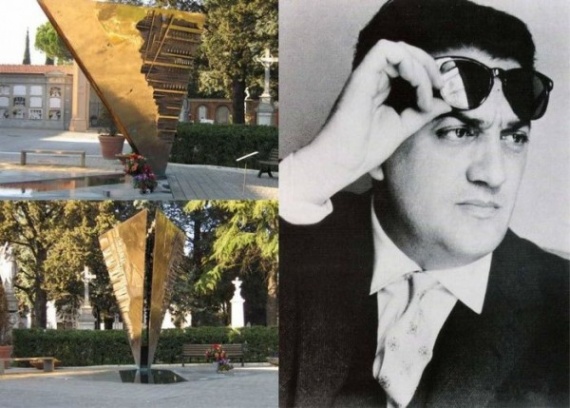 Фотографии совмещены следующим образом: справа — знаменитый человек, а слева — место, где он был похоронен. Федерико Феллини