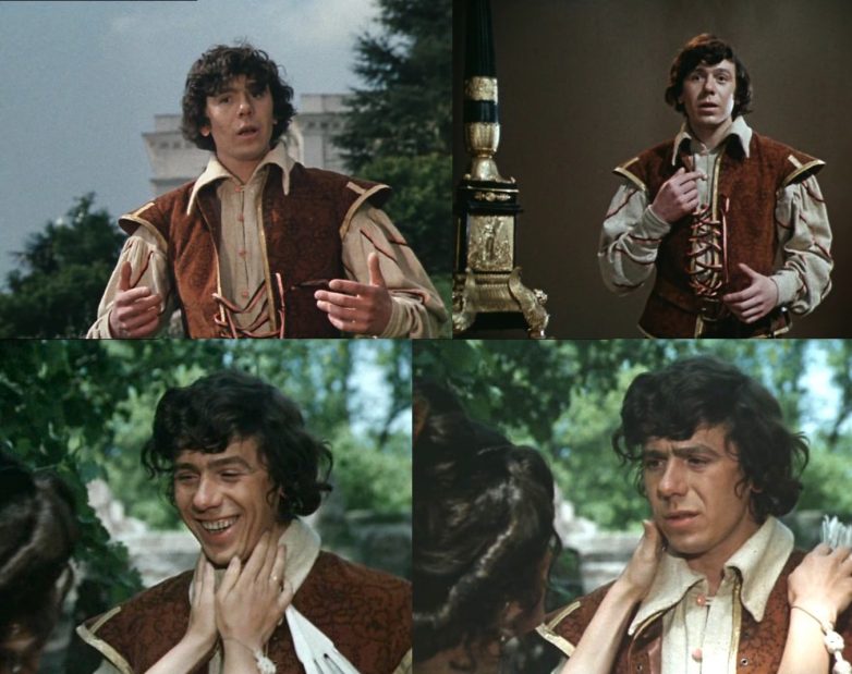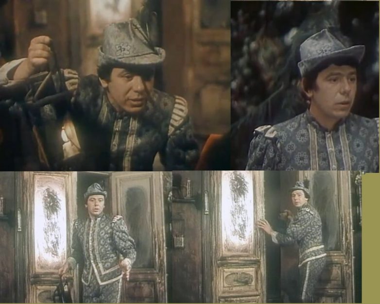 Бесподобен в исполнении актера слуга Фабьо, слуга Дианы, из музыкальной комедии «Собака на сене» (1977).