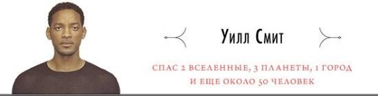 зараженную планету («Я — легенда»), планету от инопланетян («День Независимости»), предотвратил межгалактическую войну («Люди в черном»), спас вселенную («Люди в черном 2»), планету от восставших роботов («Я, робот»), около пятнадцати человек («Хэнкок»), семь человек («Семь жизней»), президента США («Дикий, дикий запад»), город от наркобарона («Плохие парни»)