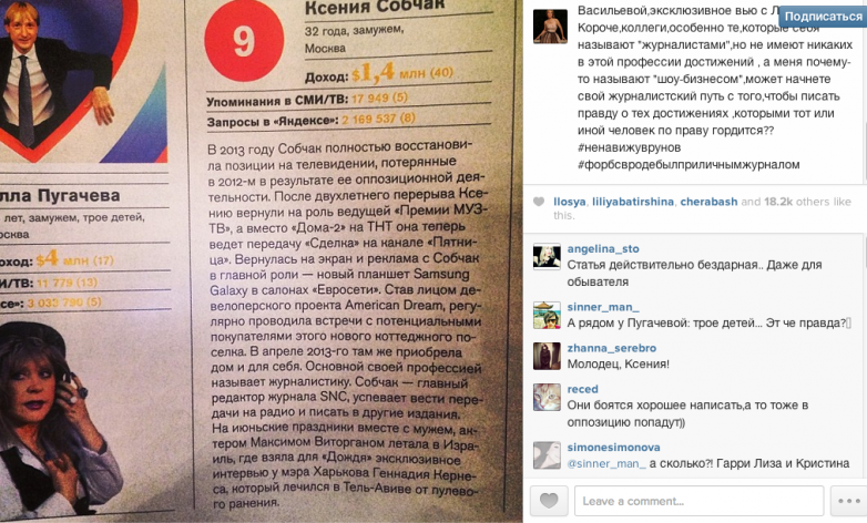 — Поздравляю коллег из «Форбса» и лично главреда г-на Муртазаева с «отличной» работой. Вот он, типичный пример, как можно написать абсолютно предвзято негативный текст, но так, что вроде как и не придраться. «Полностью восстановила позиции на ТВ» — это как понимать? Меня сняли с ведения Юрмалы, не пускают мои проекты ни на один федеральный канал до сих пор. Я веду проект на маленьком, но гордом канале «Пятница» — это называется восстановление позиций? Второе. «Своей основной профессией называет журналистику», «взяла интервью у мэра Харькова» — может, стоило упомянуть, что я сделала первое ТВ-вью с Ходорковским, Надей Толоконниковой и Алехиной, единственное интервью с Фарбером в СИЗО, первое интервью с Васильевой, эксклюзивное вью с Лукашенко… Короче, коллеги, особенно те, которые себя называют «журналистами», но не имеют никаких в этой профессии достижений, а меня почему-то называют «шоу-бизнесом», может, начнете свой журналистский путь с того, чтобы писать правду о тех достижениях, которыми тот или иной человек по праву гордится? — написала звезда в своем «инстаграме», приписав к своему сообщению хэштег #ненавижуврунов и #форбсвродебыбылприличнымжурналом.