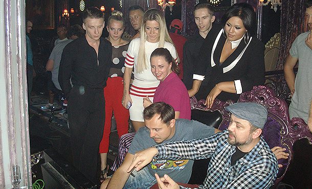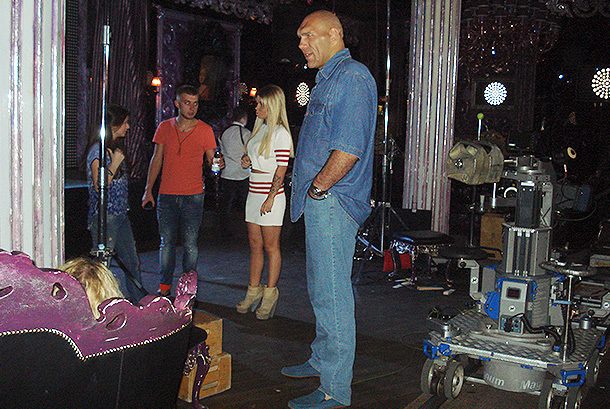 Главный герой музыкальной любовной истории Николай Валуев приехал на съемки чуть ли не раньше всех – к 10 утра – и, пока режиссер снимал общий и крупный планы Биг Бэты и эффектных танцоров-стиляг, успешно проспал до 14 часов дня. Пробудившись, боксер отправился знакомиться с режиссером, Бьянкой и своей экранной возлюбленной.