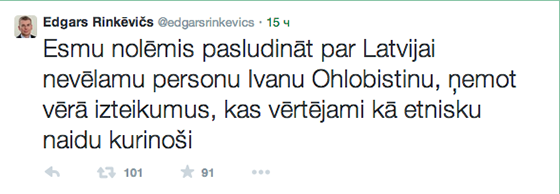 «Я принял решение объявить нежелательной персоной в Латвии Ивана Охлобыстина, принимая во внимание выступления, которые расцениваются как разжигание этнической ненависти», — пишет глава МИД Латвии в своем блоге.