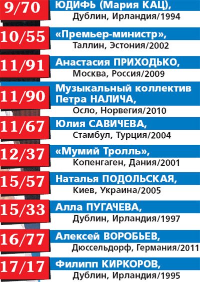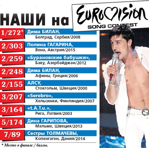 Почти 20 лет Россия принимает участие в самом популярном песенном конкурсе мира — «Евровидении». Кто от нас туда только не ездил: от примадонны Аллы до канувшей в Лету артистки с загадочным псевдонимом Юдифь. Не все успешно выступили, но были высокие результаты и даже одна победа.