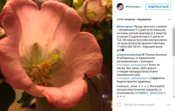 На официальной страничке в социальной сети Instagram популярная актриса Екатерина Климова, ожидающая четвертого ребенка, опубликовала фотографию цветка, а в подписи к ней – рекламное объявление. «Прошу простить и понять. Объявление!!! Сдается небольшая, но очень уютная квартира в пяти минутах от метро „Студенческая“ и пяти шагах от ТД „Москва“ на Кутузовском проспекте», – написала Климова. Далее указаны имя контактного лица и телефон. В завершение Екатерина пожелала всем хорошего дня.