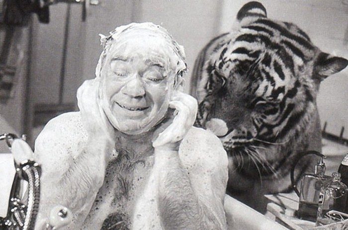 Но тигры есть тигры, и сниматься с ними Леонов мог, только отгородившись пуленепробиваемым стеклом. Так оградили перед съемками ванну, в которой должен был купаться Леонов, причем он лично проверил стекло на прочность.
