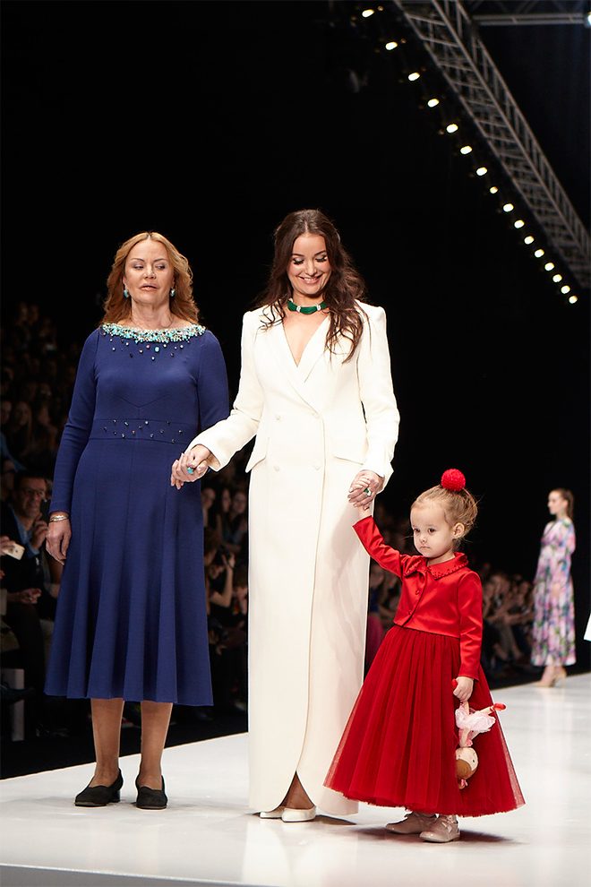Апогеем показа стало появление на подиуме дизайнера. Окcана продефилировала с мамой Еленой Алексеевной и двухлетней дочкой Лизой, подчеркнув преемственность поколений.