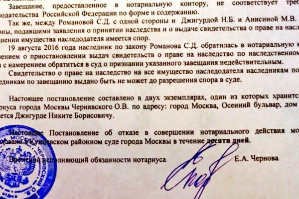 По словам Джигурды, данное завещание по непонятным ему причинам недействительно в России. Документ переведен на русский язык, однако, по законодательству, не соответствует формам, принятым на территории нашей страны. Никита принял решение обратиться с проблемой в суд, так как нотариальные конторы отказываются выдавать свидетельство о праве на наследство. Артист и его жена должны получить три московские квартиры, недвижимость за рубежом и средства на банковских счетах покойной.