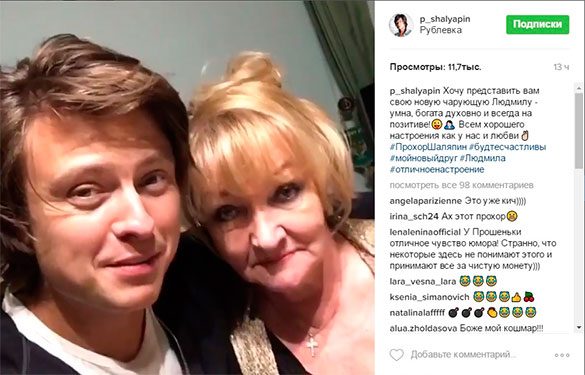 На праведный гнев дамы певец ответил безудержным смехом. Его подписчики тоже от души похохотали над парочкой. «Красивая у тебя подруга », «Прекрасная новая любовь », «Очень смешно)))))))))))))», «Вы суперские!!!», «Она мне начинает нравится», «Спасибо поднял настроение!», «Прохор! Опять за старое»?!))", «какая бойкая тетушка!) молодец!)», «Мама опять будет нервничать. Пожалей ее, Прохор! », «Страсть питает к взрослым девушкам))», «Ой, Прохор, насмешил!!! Как смачно Людмила выражается!!! », «Это уже кич)))) (здесь и далее орфография, пунктуация и стилистика авторов сохранены. – Прим. ред.)» – повеселились комментаторы.
