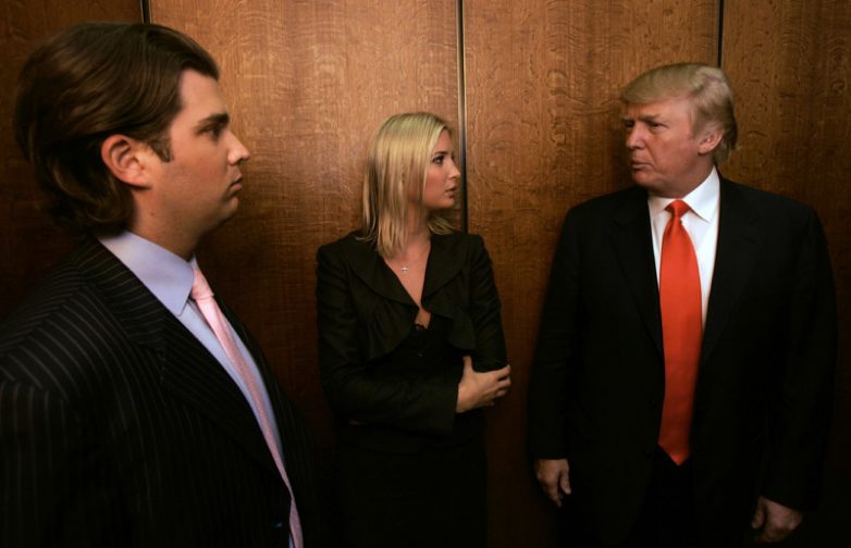 Дональд Трамп с детьми в лифте небоскреба в Чикаго, 10 мая 2006. (Фото Charles Rex Arbogast):