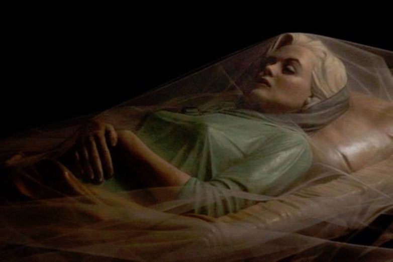 (Тело Мэрилин было сильно повреждено во время вскрытия, пришлось надеть парик, который выглядел, как и ее настоящая прическа)