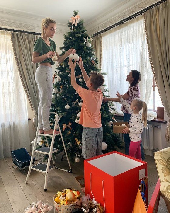 Серые брюки и постаревшая футболка зеленого цвета – подходящий наряд, чтобы нарядить елку.