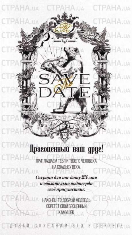 «Драгоценный наш друг! Приглашаем тебя и твоего человека на свадьбу века. Сохрани для нас дату 23 мая и обязательно подтверди свое присутствие. Наконец-то добрый медведь обретет свой бесценный камушек. Давай сохраним это в секрете», – гласит надпись на приглашении.