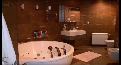 Небольшой коридор, заставленный люксовой обувью, ведет в просторную гостиную с обеденной зоной и кухней, которая расположена за выгородкой из золотой мозаики. Гримерная комната, гардеробная, спальня и просторная ванная в коричневом керамограните с роскошным джакузи.