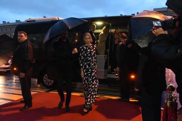 Приготовления начались после 17:00. К зданию дворца стали подъезжать машины, выгружали, посуду, декорации, цветы. Затем начали обустраивать красную дорожку, по бокам которой установили специальные золоченые столбики — все как на мировых киносмотрах. Такое решение было весьма символичным, ведь сочеталась браком пара из мира кино.