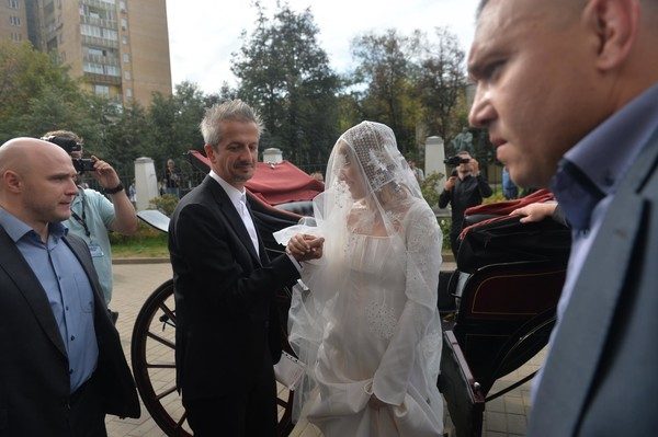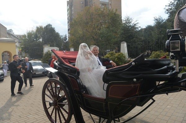 Официальная регистрация 37-летней Ксении Собчак и 44-летнего Константина Богомолова продолжилась венчанием. К храму влюбленные приехали на более традиционном транспорте, чем к загсу, однако вновь смогли удивить публику. Молодожены выбрали роскошную карету, запряженную четырьмя лошадьми. Более сдержанный стиль читался и в образах новоиспеченных супругов. Невеста сменила платье на белый наряд классического кроя, украсив голову нежной фатой вышитой цветами. Жених также предпочел строгий костюм с белой рубашкой. Впрочем, и здесь не обошлось без сюрпризов. Многие заметили, что живот Собчак подозрительно округлился.