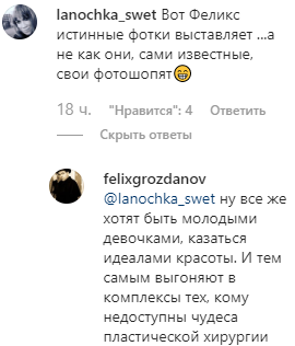 Пользователи Сети резко отреагировали на снимок Успенской от Грозданова. В комментариях хвалят журналиста за «честные» фото звезд без обработки и игр с ракурсами. Он признал, что делает это намеренно для избавления от комплексов людей, чьи возможности не позволяют прибегать к «чудесам» пластики. «Страшно смотреть на такие чудеса», — отреагировала одна из подписчиц обозревателя.