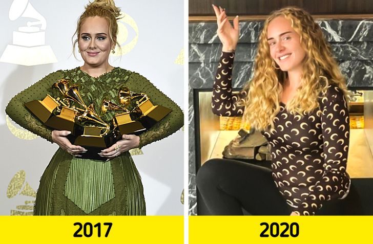За процессом похудения певицы, который длится уже больше года, с интересом наблюдает весь мир. Желание избавиться от пышных форм появилось у Адель после развода с мужем. Она сбросила лишние килограммы и теперь экспериментирует с нарядами и прическами и с удовольствием делится фото с поклонниками.