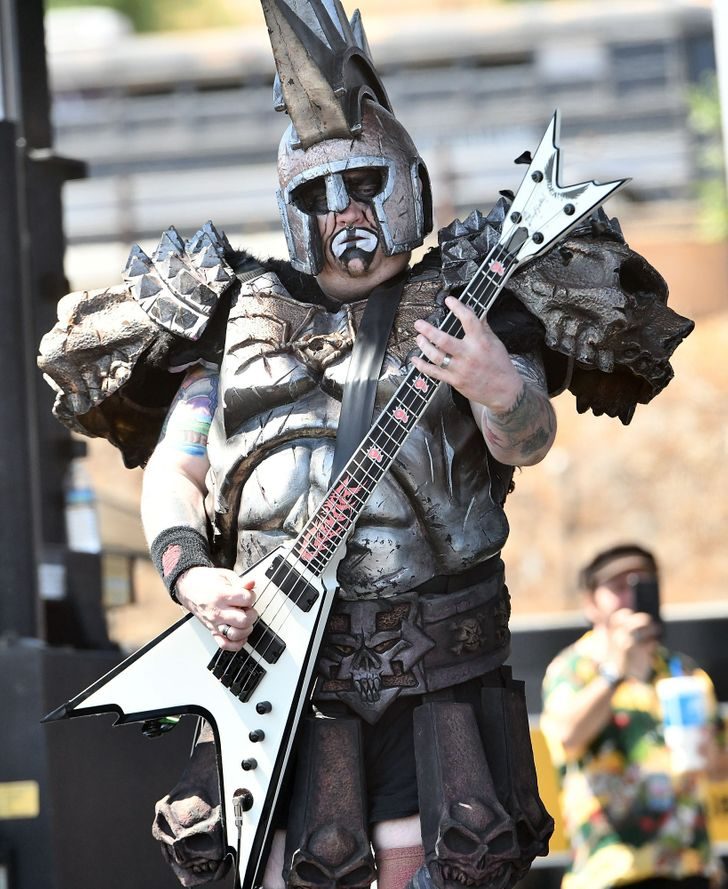 Басист хеви-метал-группы GWAR прячет лицо за огромным шлемом. Сначала он играл на гитаре, но вскоре занял место бас-гитариста. На сцене он носит доспехи в стиле римских легионеров.