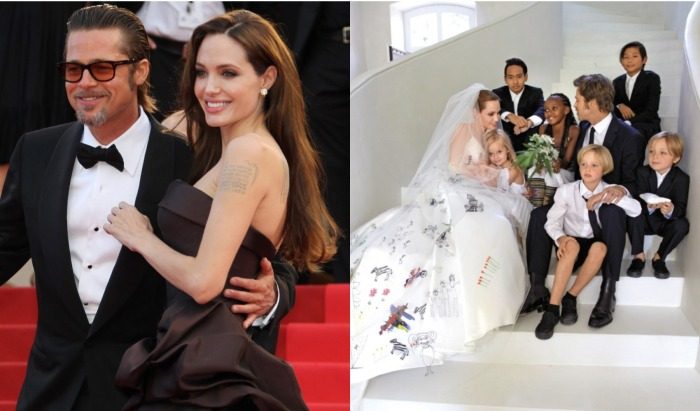 Союзу Анджелины и Брэда многие пророчили мимолетную связь, но в 2012 году, спустя восемь лет отношений, пара объявила о своей помолвке. Вообще актеры не думали связывать отношения узами брака, но о свадьбе просили их родные и усыновленные дети, которых на тот момент уже было шестеро. Церемония прошла летом 2014 года в одном из замков Франции. Фишкой свадьбы стало шелковое платье и фата невесты, которые украсили рисунки их детей.