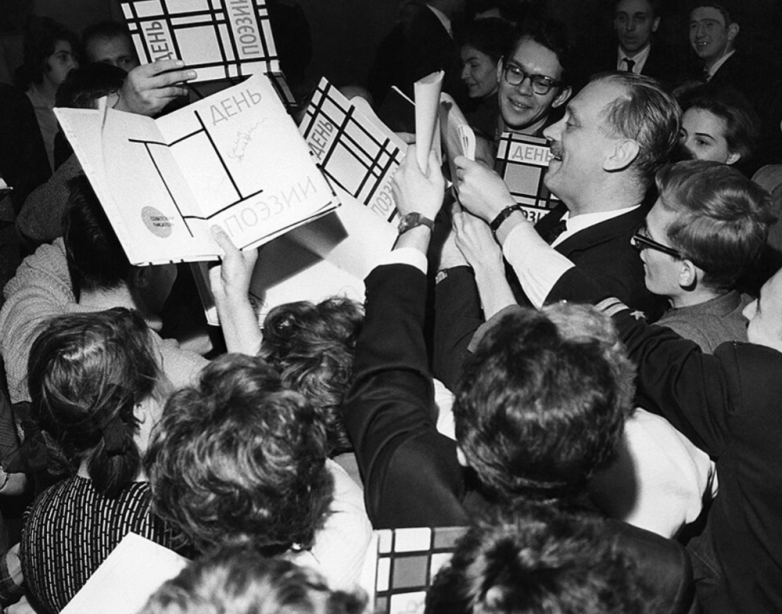 12. Сергей Михалков во время раздачи автографов на вечере поэзии на Центральном стадионе имени В. Ленина, 1961 год