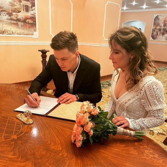 На торжестве Евдокия и Георгий появились вместе со своими питомцами, собаками Джонни и Глафирой, которых тоже нарядили в праздничные костюмы. А сами выбрали для бракосочетания весьма хулиганские образы: Евдокия сделала дерзкую стрижку с выбритыми висками, а её избранник появился в солнцезащитных очках и чёрной куртке с белями вставками. Да и счастливый отец невесты не отставал, он выбрал для свадьбы дочери ковбойский наряд.