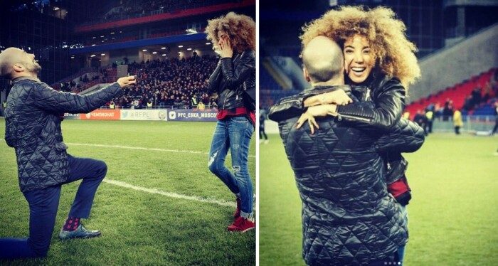 Предложение руки и сердца своей возлюбленной танцор решил сделать на стадионе в перерыве футбольного матча между ЦСКА и «Арсеналом». Таким поступком Евгений удивил не только всех зрителей, но и саму Салиму, которая прослезилась от красивого и чувственного признания в любви и неожиданного предложения. Не раздумывая она ответила «да».