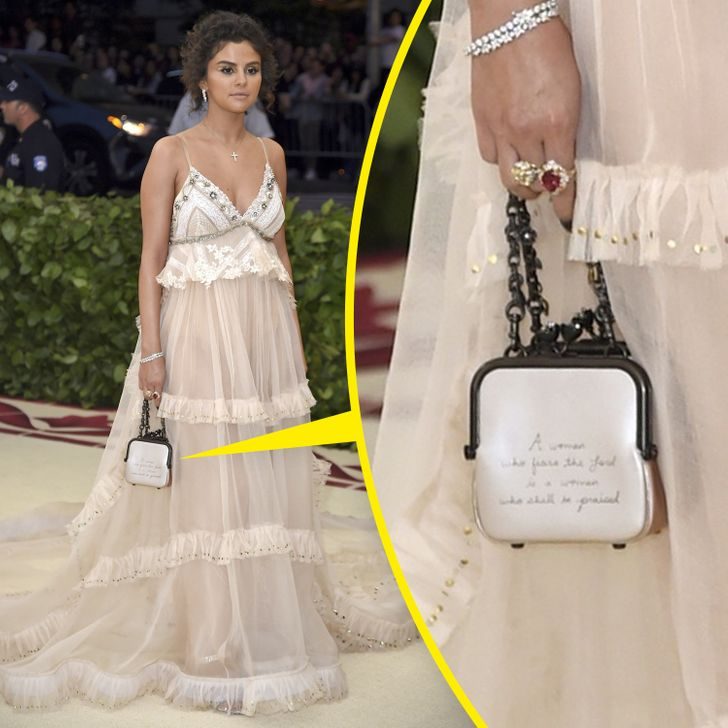 Селена Гомес любит необычные сумки и нередко использует их, чтобы отправить тайное послание. Так в 2017 году, когда девушка вышла на красную дорожку Met Gala, на ее сумке красовалась надпись «Сначала полюби себя». А в 2018 на том же мероприятии в ее руках была сумочка с фразой, выведенной рукой самой певицы.