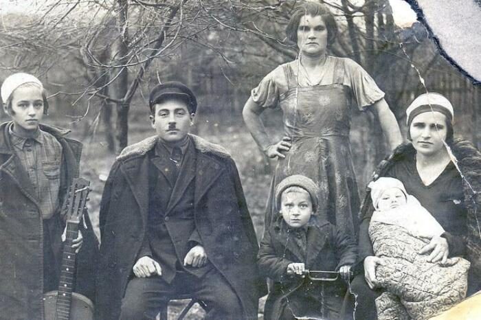 Нонна Мордюкова с гитарой, её отец, брат Геннадий на велосипеде, сестра матери, мама с маленькой Наташей на руках.