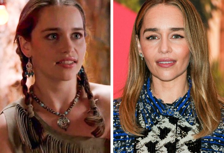 Эмилия Кларк в фильме «Атака из Триасового периода» в 2010 году и в 2023