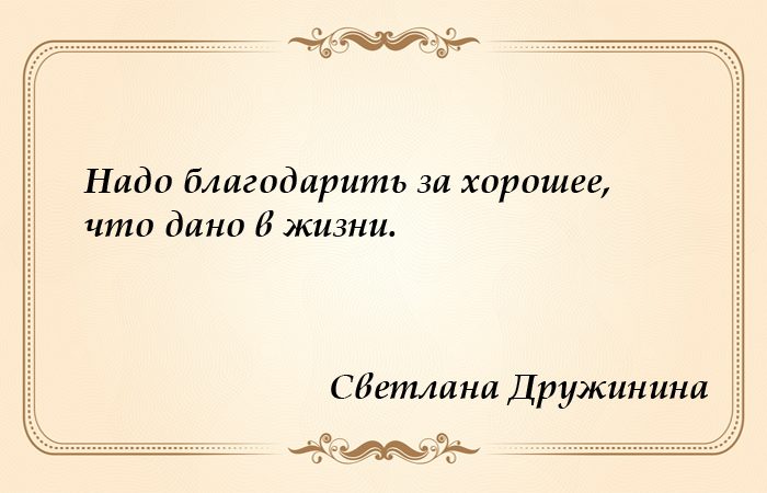 Светлана Сергеевна очень благодарный человек, она помнит всех, кто ей помогал, кто давал мудрые советы или поддерживал словом и делом. Она считает, что ей всегда везло на хороших людей, которые притягивались к ней, словно магнитом. И не устаёт благодарить судьбу за яркие встречи на своём пути. Ещё один секрет неиссякаемого оптимизма и жизнелюбия Светланы Дружининой кроется в её хорошей памяти. Она прекрасно помнит, с чего начинался её творческий путь, да и жизнь в целом. Она жила в землянке под Сталинградом, куда отправили её с мамой в эвакуацию, пыталась как можно дольше удержать во рту крохотный кусочек хлеба. Сегодня у неё есть всё и даже чуть больше, а между военной нищетой и нынешним благополучием стоит не только её собственная целеустремлённость, но ещё и помощь тех людей, которые встречались ей на пути.