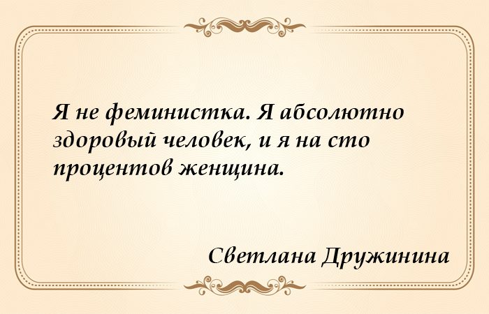 Светлана Дружинина не считает, что выбрала мужскую профессию. Она уверена: она выбрала свою профессию и делает то, что умеет лучше всего – снимать кино. Светлана Сергеевна не рвётся никому доказывать своё право снимать кино, она просто работает, оставаясь при этом женщиной на все 100 процентов. И ей нравится быть красивой и женственной. По словам Светланы Дружининой, на встречу с высокими чиновниками она отправляется «как Наташа Ростова на свой первый бал»: в красивом наряде, с макияжем и причёской. И она в состоянии увидеть мужчину насквозь, по крайней мере она с первого взгляда замечает, как относится мужчина к женщинам вообще и к красивым в частности.