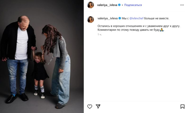 «Остались в хороших отношениях и с уважением друг к другу. Комментарии по этому поводу давать не буду», — написала Валерия в соцсетях.
