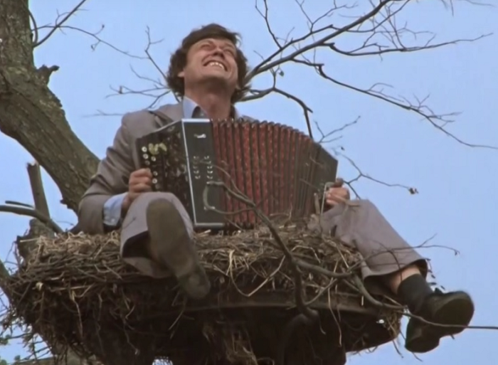 Для Караченцова роль Васьки стала одной из самых любимых, но и самых трудных. Знаменитая сцена, где его герой сидит в гнезде аиста с гармошкой, едва не сорвалась из-за панического страха актера перед высотой. Николай Петрович категорически отказывался лезть на дерево. В итоге на съемочную площадку вызвали пожарный расчет. Актера поднимали в «гнездо» на люльке крана, а чтобы он не потерял сознание от ужаса, оператор просил его смотреть только в небо. Так родился пронзительный взгляд Васьки, устремленный к облакам под звуки частушек.
